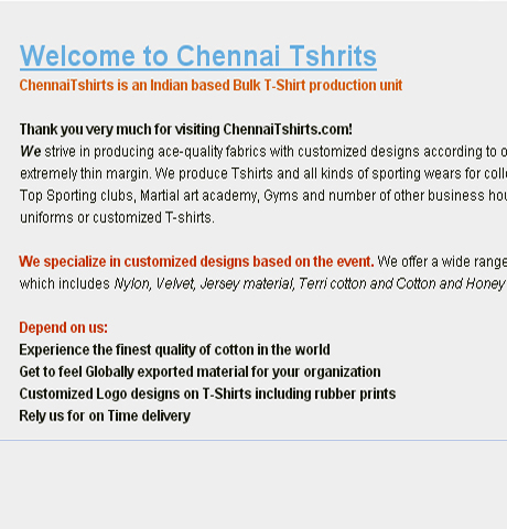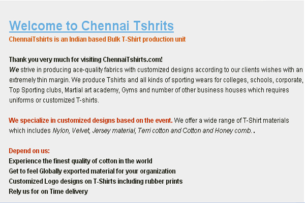 Branding, Web DesignChennai's leading manufactures of Printed Tshirts, Chennai Tshirts' spends its maximum revenue in advertising towards SEO, that is how important it is to be listed on the top of Google! their key keyword is "Tshirts printing in Chennai" and our SEO geeks have made sure that their website comfortably stays on top.